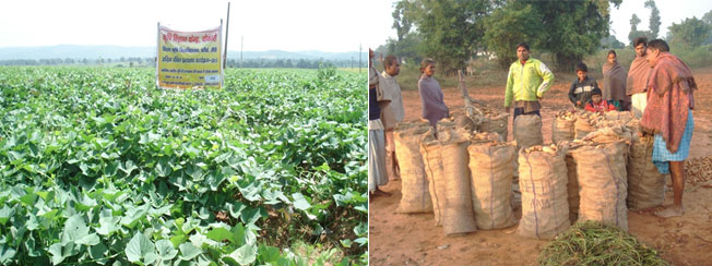 So for resource poor farmer 50% RDF (20:30:30 N P2O5: K2Okg/ha) and for resource rich farmer 100% RDF (50:60:60 N:P2O5: K2O kg/ha) is recommended. This technology is also suited in drought/ intermittent drought condition as a contingent crop. The technology has been recommended to ATMA Bokaro for large scale extrapolation. KVK Bokaro has also taken this technology for FLD in farmer’s field in 2012-13 & 2013-14. The technology has been widely adopted by farmer’s of Bokaro and Ramgarh district in upland acidic soil. This year 2013-14, sweet potato has been cultivated in about 200ha area using balanced amount of nutrients in Petarwar, Kasmar block of Bokaro and adjoining Gola block of Ramgarh and they have earned huge profit from their uncultivated acidic upland soils. About 50 truck load of sweet potato had been sent to West Bengal from these villages.